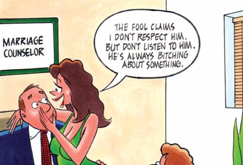 Kristin’s husband Daniel always insisted on making love in the dark. After obliging him for 20 years, Kristin finally turned on a bedroom light one night and found Daniel holding a huge dildo. “You impotent, limp-dicked bastard!” she screamed. “How could you deceive me all these years?!” Daniel looked his wife straight in the eye...